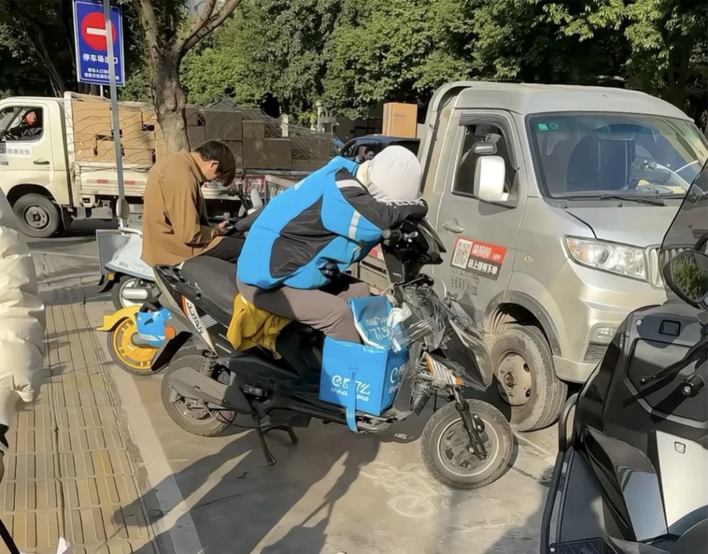 网友发图曝料称外卖骑手午休时将脚放在保温箱里。